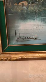 Grande quadro vintage dipinto a olio su tela, firmato dall’autore, raffigurante paesaggio con lago, alberi e casa di campagna.