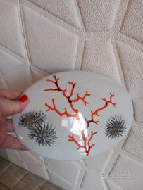 Grande scatola a cofanetto, in porcellana di Limonges, ovale, dipinta a mano con raro disegno di rametto di corallo e ricci di mare. Nuova mai usata ma vintage. Lucidissima, intonsa, senza segni o difetti. Speciale.