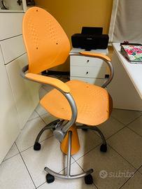 Grande scrivania bianca da ufficio o lavoro, con lampada fissata (rimovibile) e cassettiera con cassetti. Completano la sedia girevole ergonomica e due sedie nere per visitatori / clienti