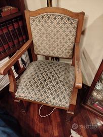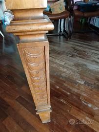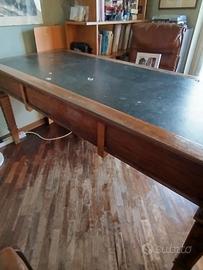 Vendo grande ed elegante scrivania antica in legno massello, stile liberty, con gambe decorate, fregi e applicazioni in ottone/bronzo con disegno liberty e piano rivestito in pelle verde scuro. Il mobile è dotato di tre cassetti frontali Condizioni: il mobile è originale, strutturalmente solido, ma necessita di restauro (pulizia, lucidatura, eventuale ripristino della pelle e delle finiture). Presenta segni del tempo coerenti con l’età, che ne attestano l’autenticità e visibili in foto Epoca: primi ‘900 realizzata dalla rinomata fabbrica Ducrot. E’ corredata da poltrona rivestita in velluto operato verde e beige, originale, in buone condizione, che presenta nelle gambe analogo decoro della scrivania come da foto; è in buone condizioni , ma necessita di restauro (pulizia, lucidatura) Dimensione scrivania: cm183x80x84circa Dimensione sedia: cm57x50x100 circa Si possono mandare ulteriori foto, se richieste Ritiro a carico dell’acquirente