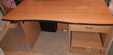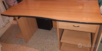 Bellissima e spaziosa scrivania color legno chiaro, molto solida, comprende il ripiano porta pc con buco per i cavi, 2 ripiani estraibili per tastiera e stampante, cassetto.