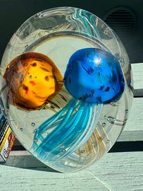 Una medusa è in blu cobalto profondo, l’altra in ambra aranciata, con filamenti interni turchesi e avorio che creano un movimento fluido e tridimensionale.