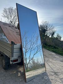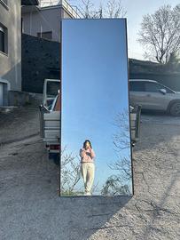 Enorme anta in legno da armadio specchiata di recupero . (Roba immortale no Ikea) 260 altezza x 100 larghezza. perfetta per essere istallata a parete per uno specchio scenografico e spettacolare a tutta altezza , oppure in orizzontale da metà parete. Lo specchio è perfetto. qualche scheggiatura sul profilo di legno perché deve essere stato trascinato a terra . ma tanto si presta per essere incastonata in una nuova cornice . Oppure per chi ha praticità si smonta lo specchio da solo. Ritiro in zona con mezzo idoneo per peso e dimensioni. Posso aiutare a caricare .