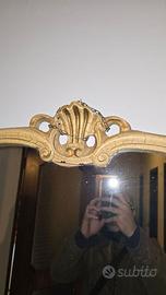 Magnifica specchiera contraddistinta da una sontuosa cornice finemente intagliata con elementi artistici che si completano in una nobile cimasa centrale.