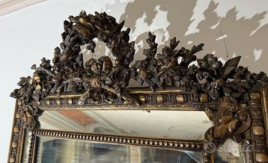 Grande specchiera antica in legno intagliato e dorato, realizzata in elegante stile Luigi XVI. Cornice riccamente decorata con motivi floreali, ghirlande e cimasa scolpita, di forte impatto estetico. Specchio originale presente, con segni del tempo coerenti con l’età. Dimensioni: circa 180 × 100 cm Oggetto proveniente da abitazione privata, posizionato sopra camino. Presenta patina e normale usura. Specchiera di grande presenza, adatta sia ad ambienti classici che a contesti moderni in contrasto.