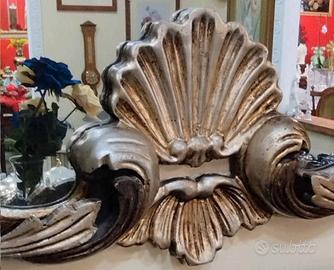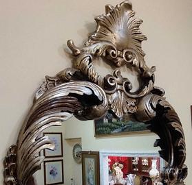 Meraviglioso e imponente specchio in stile Barocco, in legno gessato intagliato, colore argento con riflessi dorati.