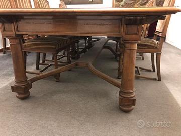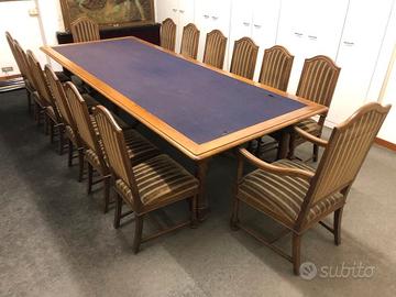 Grande tavolo da riunione completo di 13 sedie e 1 poltrona. Noce massello, epoca fine ‘800. Reca etichetta: