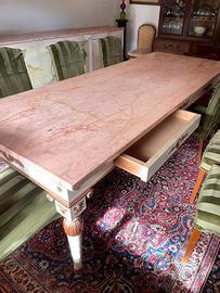 Il tavolo è impreziosito da un ampio piano in marmo Rosa Portogallo, di grande qualità, con bordo nello stesso marmo.