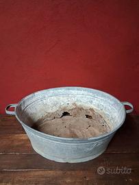 Grande tinozza / mastello ovale vintage in lamiera zincata, autentico pezzo della tradizione contadina italiana, un tempo utilizzato per il bucato o la vendemmia.
