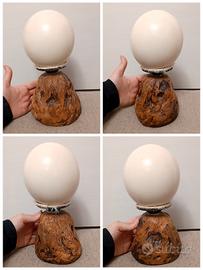 Grande e vero uovo di struzzo su base artigianale in legno naturale.