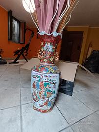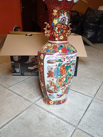 Vendo vaso orientale in porcellana di grandi dimensioni, riccamente decorato con scene tradizionali orientali, fiori e dettagli dorati.