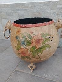 Cache pot vintage in metallo con decorazione floreale dettagli in foto altezza 46 diametro sopra 34.5 lunghezza con maniglie 63 piuttosto pesante Bellissimo con i suoi segni del tempo non per tutti spedisco con BRT