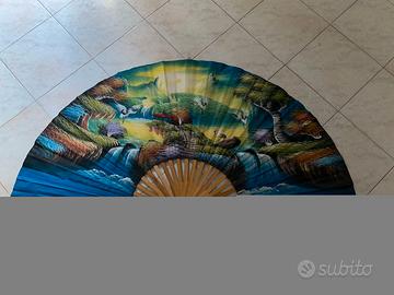 Grande ventaglio da parete pieghevole batik con disegno asiatico, bellissime colorazioni, dipinto a mano, come nuovo, larghezza cm 150, alto 75 cm