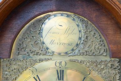 ** James Mylne is listed as working in Montrose from 1740 onwards. This clock features the very rare feature of initials engraved .