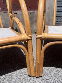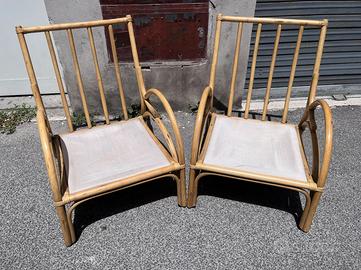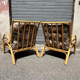 La struttura è interamente realizzata in robusto e leggero bambù curvato, che forma linee sinuose e avvolgenti, tipiche dell'artigianato italiano di quel periodo. Ogni poltrona è dotata di ampi e morbidi cuscini con una vivace fantasia floreale che aggiunge un tocco di colore e un'estetica giocosa, offrendo un comfort ottimale per lunghi momenti di relax.