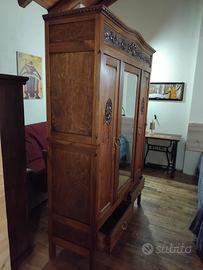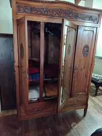 Guardaroba ottime condizioni, legno di pioppo, a 3 ante e 2 cassetti. H215x151x50 cm in stile liberty, intagli floreali e manigliette originali.