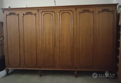 Armadio larghezza 300 cm, altezza 188, profondità 62. Interno in legno chiaro, due grandi cassetti nelle ante centrali.