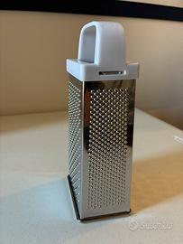Grattuggia in acciao con manici in plastica. Ha 4 lati diverse per diversi modo di grattuggiare. Lavabile in lavastoviglie. Acquistata all’Esselunga e usata una volta sola.