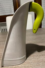Grattuccia da tavolo con manico e 3 lame intercambiabili. Struttura in plastica e cassetto di raccolta. La grattuggia più fine presenta la plastica di cornice scheggiata, ma non ne pregiudica l’utilizzo.