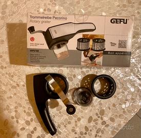 Grattugia a manovella Gefu modello Pecorino con due lame intercambiabili, per grattugiare formaggio, noci, cioccolato, con recipiente chiudibile, smontabile, lavabile in lavastoviglie. Vendo perché ricevuto altro regalo analogo