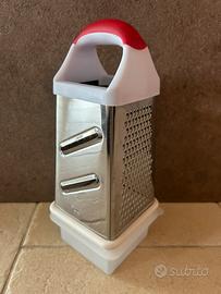 Grattugia in acciaio inox a 4 facce con manico e contenitore in plastica. Grattugia per formaggi stagionati. Julienne fine per verdura. Lama per affettare.