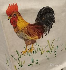 Grande grembiule da cucina (cm 107x68) in lino, bianco, con immagini di galli DIPINTI A MANO. Nuovo, mai usato.