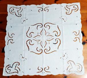 - tovaglietta ricamata a macchina con intarsi, bianca. misure: cm79x82 euro 10,00.