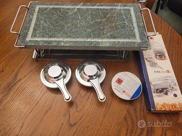 griglia da tavolo kasanova con pietra ollare (37×19 cm), base in acciaio cromato e 2 bruciatori. inclusi anche 4 paste per combustibile sicure. In buono stato, usata poche volte; i bruciatori sono leggermente usurati dalla fiamma come visibile dalla foto.