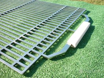 Griglia di cottura per barbecue a legna e carbonella in acciaio inox AISI 304 ricavata da lastra di spessore 6mm e maniglie antiscottatura in legno di abete.