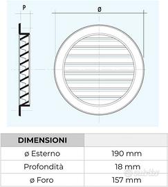 Griglia di ventilazione in plastica tonda ø 190 mm da incasso; idonea per fori ø 157 mm; Passaggio aria 135 cm²; completa di rete antinsetti; colore bianco