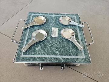 Include pietra con supporto, vassoio e fornellini alimentati a combustibile gel. mai usato, no scatola