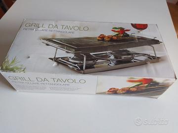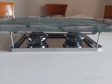 Vendo grill da tavolo Rechaud con pietra ollare rettangolare, perfetto per grigliare carne, pesce o verdure direttamente a tavola in modo sano e gustoso.