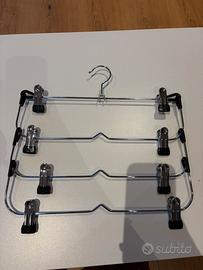Gruccia salvaspazio in metallo cromato con 4 livelli e clip antiscivolo, ideale per appendere pantaloncini, gonne o accessori.