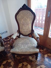 Vendo gruppo di sei sedie e due poltrone '800 con schienale a scudo in noce intagliato. Ottime condizioni di struttura e imbottitura.