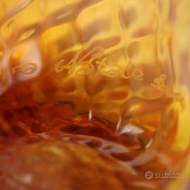 Gruppo di tre vasi in vetro soffiato color arancio opalescente. Lavorazione a