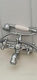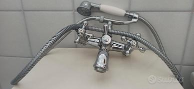 Rubinetteria classica modello Grazia marchio Nobili, in ottone cromato con finitura bianca, per ambienti bagno in stile classico e raffinato. Manopole a “4 punte”. Installato a muro e dotato di bocca vasca fissa, questo gruppo vasca offre un miscelatore bicomando con deviatore manuale e doccetta monogetto con flessibile da 150cm, ideale per un utilizzo funzionale e pratico all'interno della vasca. Per le ottime condizioni della rubinetteria e per il valore effettivo di mercato il prezzo di vendita è un vero affare.