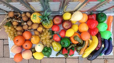 Vendo tutto il gruppo in foto di elementi che riproducono scala 1/1 frutta e ortaggi di vario tipo in plastica, mele, uva, pesche, melanzane, banane, pere, arance, etc...