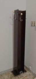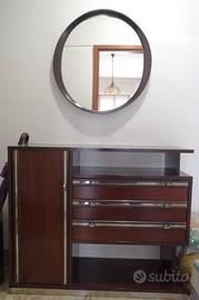 Gruppo mobili per ingresso appartamento degli anni ’70 in legno composto da: un mobiletto con 3 cassetti e una antina dimensioni cm. 104 x 35 x H 88 – una specchiera di diametro cm. 69 – un appendiabiti di dimensioni cm. 24 x 40 x H 178 – un portaombrelli di dimensioni cm. 30 x 30 x H 43. Il tutto molto ben conservato. I mobili si trovano in appartamento sito al terzo piano di condominio (con ascensore).