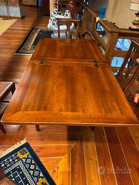 Il tavolo presenta una splendida finitura calda color noce, con piano solido e struttura robusta. È dotato di allunga centrale a libro con cerniere in metallo, ideale per aumentare la superficie quando necessario.