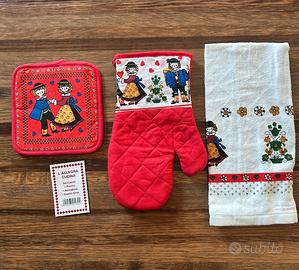Vendo set da cucina a tema natalizio: guanto per il forno, presina e asciughino. 100% cotone. Nuovo, mai usato, in confezione originale.