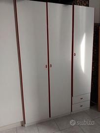Armadio guardaroba in legno bianco con profili rossi , altezza 198 cm, larghezza 138 cm , profondità 46 cm , tre ante, due per il corpo centrale per i capi appesi e una laterale a scelta per capi appesi o ripiani e due cassetti in basso. ottime condizioni ,Ritiro a carico dell'acquirente oppure posso consegnare previo contributo aggiuntivo per il trasporto, calcolato in base alla distanza se si tratta di zone oltre 5 km dal quartiere . Per il montaggio punto possiamo aiutarvi dando indicazioni, comunque è molto semplice