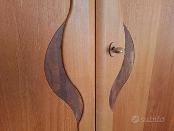 Così composto: 5 ante (2 doppie laterali ed una singola centrale); cassettiera molto capiente con 4 cassetti, mensole e appendiabiti (vedere immagini).