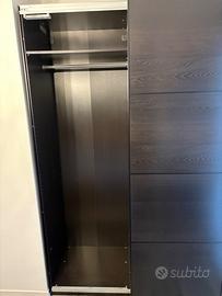 Vendo guardaroba Ikea Pax con ante scorrevoli. Colore marrone scuro 1 anta colore struttura e 1 anta a specchio Accessori interni: 1 bastone per grucce 3 cassetti ammortizzati 1 ripiano estraibile ammortizzato 5 ripiani Larghezza 150 Altezza 236 Profondità 60 Profondità con porte scorrevoli 67