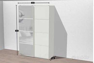 Vendo guardaroba Pax Ikea bianco come da foto, in ottime condizioni, pari al nuovo. Larghezza 150 cm, profondità 66 cm, altezza 238 cm. Doppia anta scorrevole con specchio. Smontaggio e trasporto a carico dell'acquirente.