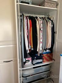 Guardaroba sei ante bianco laccato, con 3 cassetti molto capienti, scomparti per inserire vanette e una parte per riporre abiti lunghi. Misure: lunghezza 3mt, altezza 2,36mt, profondità 61cm.
