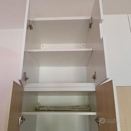 I colori sono: noce chiaro, bianco e rosa. La disposizione dei pensili può cambiare in base ai propri gusti e necessità.