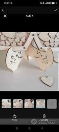 Guestbook per evento in legno a forma di cuore, con due sacchettini di cuori in legno di varie dimensioni, con la possibilità di scrivere sia fuori con i nomi dei sposi, sia nei cuoricini per poi infilarli dentro e così rimane un bel ricordo.