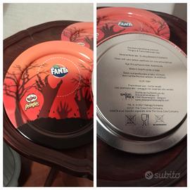 questi sottobicchieri venivano regalati con la Fanta e un tubo di patatine Pringles. Non erano in vendita, perciò diventate degli oggetti da collezione, il loro design a tema horror con rami secchi,mani di zombie. Hanno i loghi dei due Brand pubblicitari, sono di diametro di circa 14 cm. ne ho 21 pezzi. € 1,00 ciascuno