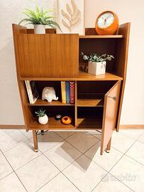 Il mobile presenta una combinazione funzionale di vani a giorno, un'anta a ribalta che può fungere da piccolo scrittoio o mobile bar.