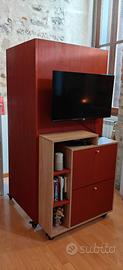 Lato esterno con TV montata e mobiletto frontale con mensole e due vani a ribalta.